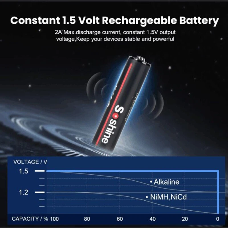 على عكس معظم البطاريات القابلة للشحن النيكل (NiMH) التي توفر 1.2 فولت، بطاريات Soshine توفر جهدًا ثابتًا 1.5 فولت مما يحسن أداء الأجهزة خصوصًا تلك التي تتطلب طاقة دقيقة وثابتة مثل الماوسات اللاسلكية وأجهزة التحكم.